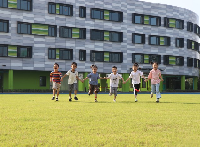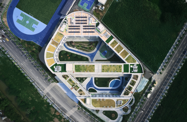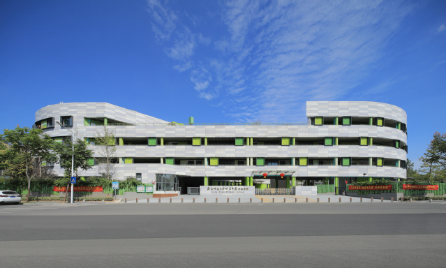 河西新城四小位于南京市建鄴區(qū)江山大街以北、黃山路以東,建筑面積2.79萬平方米,教學(xué)樓主體4層,局部3層,地下1層,建筑高度16.95米,可容納教職工和學(xué)生1705人。建筑整體采用扁平化“曰”字形結(jié)構(gòu),包含傳道授業(yè)的教學(xué)理念,造型可演化為鉛筆、書籍、綠葉,寓意在學(xué)習(xí)中獲得知識、不斷成長。