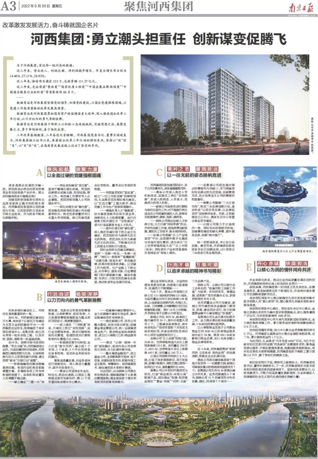 通過(guò)全面深化改革,企業(yè)的治理體系更加完善,治理能力顯著提升,發(fā)展活力不斷增強(qiáng)。今年7月,奧體公司競(jìng)得江北核心區(qū)G11地塊和河西南G31地塊,與高科置業(yè)合作開(kāi)發(fā)仙林湖G38地塊,以全新姿態(tài)深耕河西,布局江北、仙林。江尚紫薇、云尚紫薇首開(kāi)區(qū)已達(dá)銷售形象進(jìn)度,預(yù)計(jì)10月上市銷售,丹若園也將于近期公開(kāi)樣板區(qū)。新城公司僅2022年,就承擔(dān)工程代建項(xiàng)目39個(gè),其中市級(jí)重大項(xiàng)目5個(gè)。工程建設(shè)高效推進(jìn),其中南京憲法廣場(chǎng)項(xiàng)目提前7天完成主體結(jié)構(gòu)封頂,華泰證券研發(fā)及培訓(xùn)中心項(xiàng)目也提前順利開(kāi)工。會(huì)展公司“云上會(huì)展”優(yōu)勢(shì)凸顯,2020年,世界智能制造大會(huì)云上展館參展商3312家,訪問(wèn)量近250萬(wàn)人;2021年,世界制造大會(huì)云上參展商4471家,訪問(wèn)量達(dá)342萬(wàn)人。公園公司深耕河西濱江8大公園,打造了南京眼旅游區(qū)、荷蘭友誼園、魚(yú)嘴燈塔落日、消防主題公園等一批網(wǎng)紅打卡點(diǎn),客流量提升近40%。商管公司以中和村四期項(xiàng)目為依托,打造“商業(yè)街區(qū)+長(zhǎng)租公寓”聯(lián)營(yíng)產(chǎn)品,成功推出“和里·和你商業(yè)街區(qū)”“紫金·和寓”“河西·云座”三大品牌產(chǎn)品。園林公司、公園公司以被市總工會(huì)命名的“趙康兵職工創(chuàng)新工作室”為紐帶,在科研項(xiàng)目、課題實(shí)施、成果推廣等方面融合互動(dòng),獲得國(guó)家授權(quán)專利8項(xiàng)。由河西置業(yè)公司開(kāi)發(fā)建設(shè)、新城公司代建的南京金融城三期項(xiàng)目,招商、建設(shè)同步進(jìn)行,助力東部重要金融中心建設(shè)跑出“加速度”。青奧城公司扎實(shí)開(kāi)展對(duì)標(biāo)提升工作,全力推動(dòng)酒店板塊高質(zhì)量發(fā)展,3年來(lái)利潤(rùn)增長(zhǎng)超兩倍。奧體物業(yè)位列2020年江蘇省物業(yè)服務(wù)綜合實(shí)力50強(qiáng),榮獲2021年南京影響力物業(yè)品牌、2021年南京暖心物業(yè)品牌等稱號(hào)?!?年來(lái),河西集團(tuán)秉持“深耕河西 立足南京 面向全國(guó)”的發(fā)展戰(zhàn)略,積極走出去拓展市場(chǎng):奧體公司成功建設(shè)集團(tuán)首個(gè)異地開(kāi)發(fā)項(xiàng)目——無(wú)錫紫蘭園;新城公司承接安徽眾彩物流園等監(jiān)理項(xiàng)目7個(gè);青奧城公司先后與30家酒店建立合作關(guān)系,業(yè)務(wù)范圍遍及6個(gè)省市;園林公司12個(gè)在建項(xiàng)目分布在安徽、湖北、河南等7個(gè)省市……